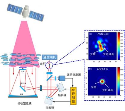 自适应光学技术是克服星地激光通信大气湍流效应的核心技术之一。该技术通过使用可变形镜面校正因大气抖动造成光波波前发生畸变,从而改进光学系统性能。自适应光学系统由波前探测器、波前控制器、波前校正器(变形镜和倾斜镜)组成。利用自适应光学技术可抑制大气湍流对通信信号光的影响,获得近衍射极限的校正光斑,从而提高通信端机对信号光的接收效率。2020年3月,光电所成功将自适应光学技术应用于实践二十卫星对地的激光通信试验,助力我国实现了10Gbps的星地激光通信。