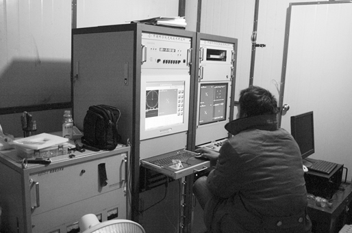 科研人员在寒冷的板房内操作望远镜控制装置
