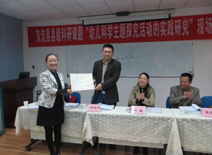 双流县研培中心理论室主任易恩主持了我所幼儿园承担的县级课题《幼儿科学主题探究活动的实践研究》结题鉴定会。会前,课题组通过小中大三个科学主题探究活动、课题研究过程性材料、幼儿探究活动影像、课题研究展板等展示了我园课题研究的扎实过程。会上,保教主任王兵代表课题组通过讲述、微课展示、图片、数据等向与会者汇报了研究历程、研究措施及研究成果。