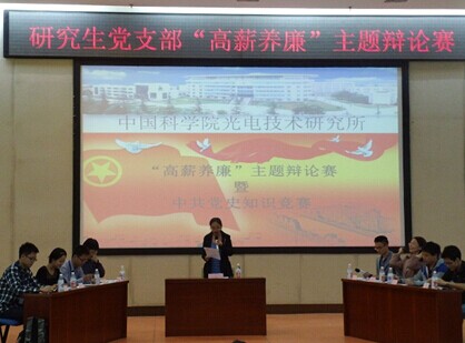 2014年10月24日下午两点,研究生党支部在学术报告厅举办主题党日活动。活动包括“高薪养廉”主题辩论赛及中共党史知识竞赛两个环节。所党委委员唐小萍、党办主任王倩、一室党支部书记亓波、研究生党支部书记廖俊莉以及一百余名研究生参加了此次活动。