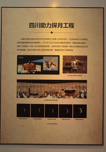 此次展览由国家国防科技工业局和四川省人民政府主办,中国科学院等多家单位协办。展览共展出20多组实物模型,我所负责研制的地形地貌相机模型被展出。嫦娥三号任务中,我所研究开发的地形地貌相机成功拍摄“玉兔”携国旗的清晰彩色图像,是中国国旗在地外天体上的第一次“留影”亮相,为中国探月工程的发展添上了浓墨重彩的一笔。