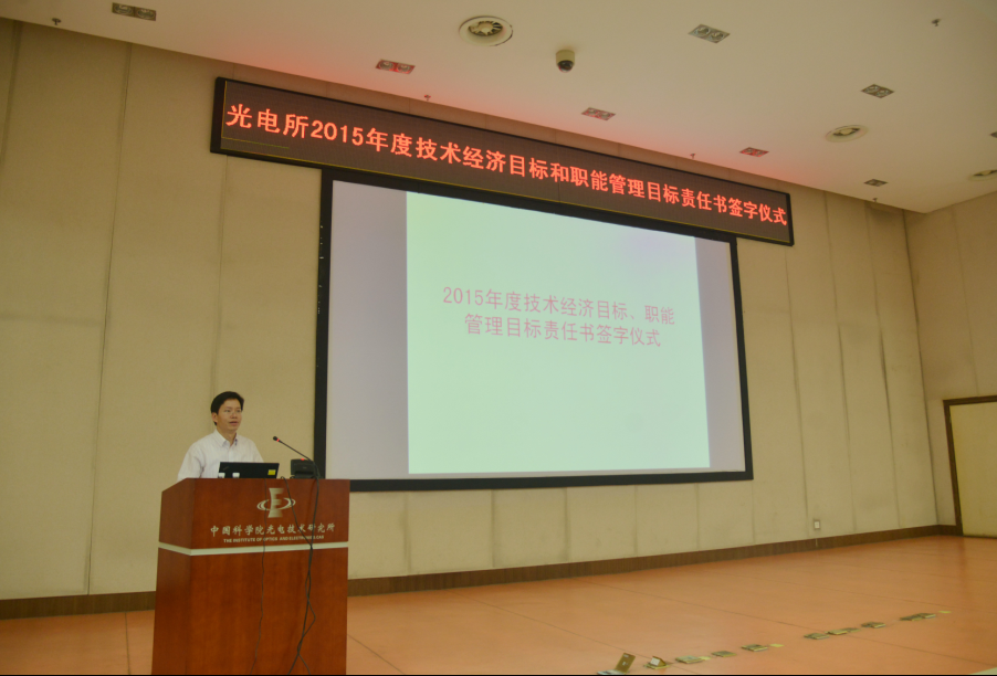 党委书记杨虎在会上讲话。他首先强调了签订技术经济目标和职能管理目标责任书的必要性。他说,年度责任目标是我所长期战略目标的微观体现,年度重点工作是实现光电所整体目标的阶段性推进动作;同时,根据年度责任目标完成情况,可有效检视我所本年度在科研创新和职能管理等方面的效果,为来年工作目标的设定提供前期情况评估参考,从而使光电所总体目标能够有条不紊地制定,并得到后期修订和有力落实,由此形成一套健全完善的良性循环系统。
