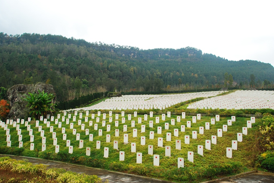 当迈入那个庄严肃穆的陵园,一股崇高的敬意油然而生。来到烈士墓前,深深地三鞠躬。红军将士奔赴硝烟弥漫的战场,冲锋陷阵的景像浮现脑海;战马嘶鸣,枪声阵阵,杀声震天回响耳畔;它似乎把我们带到了那个火红年代,又重现了无数英雄抛头颅、洒热血为新中国诞生而英勇倒下的场景……。从山顶高处俯瞰,呈巨大扇形分布的点缀着红五星的白色烈士墓群气势磅礴、巍峨壮观,掩映在苍松翠柏间,辉映于金色阳光下,红星闪闪,给心灵以极大的震撼。