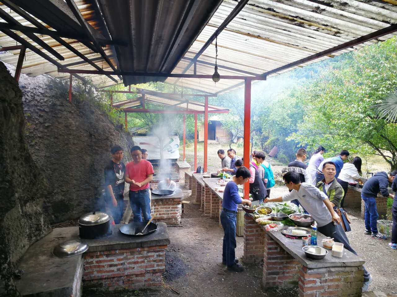 在第一天的党建带团建主题活动结束之后,第二天一早所有人员经过长途跋涉达到位于雾山的素质拓展营地开展“吃苦”之行。带队的户外教练向全体人员传授了基本且非常实用的野外求生技能,包括不同环境下的方向辨别技能、野外生火方法、系绳结实用技巧等。之后,三十余位学员来到一处峭壁之下开始了攀岩比赛,每个人都完成了对自我的一次挑战。攀岩之后已过正午,三十余位科研工作者们进行了野炊做饭环节,大家分工明确、有条不紊,在条件极其简陋的情况下做出了一道道色香味俱佳的饭菜。