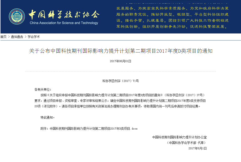 中国科技期刊国际影响力提升计划是由中国科协、财政部、教育部、国家新闻出版广电总局、中国科学院、中国工程院等六部门联合实施,面向全国英文科技期刊的重大资助项目。影响力提升计划D类项目旨在支持创办一批具有国际影响力,服务国家科技发展的一流科技期刊,意义重大。要通过本次评审,遴选出真正能够代表我国前沿学科和优势学科,或能填补国内英文科技期刊学科空白的高水平新刊。