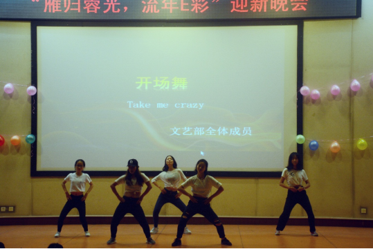 伴随着欢乐的暖场音乐,晚会于七点准时开始。在文艺部全体成员欢乐而富有青春气息的开场舞——Take Me Crazy将现场气氛完全调动起来之后,主持人何德伟和汪新梅同学登场宣布晚会正式开始。节目形式丰富多彩,有婉转动听的吉他弹唱、高亢通透的美声唱腔、激情澎湃的二胡独奏,还有动感十足的架子鼓表演,以及趣味横生的近景魔术。