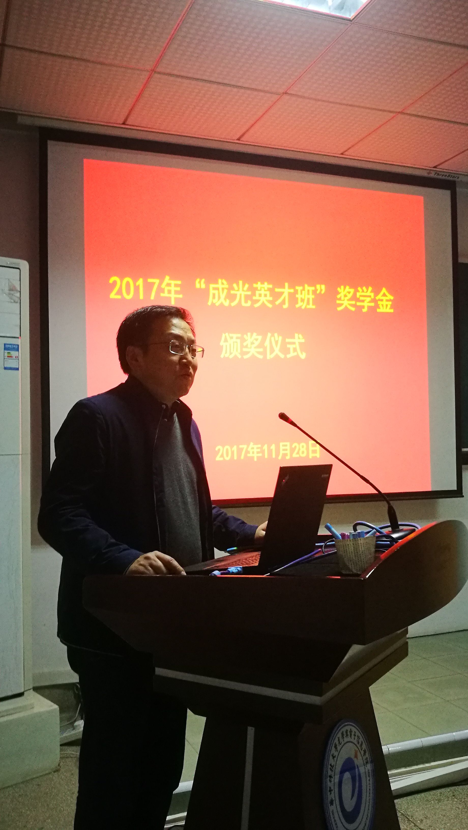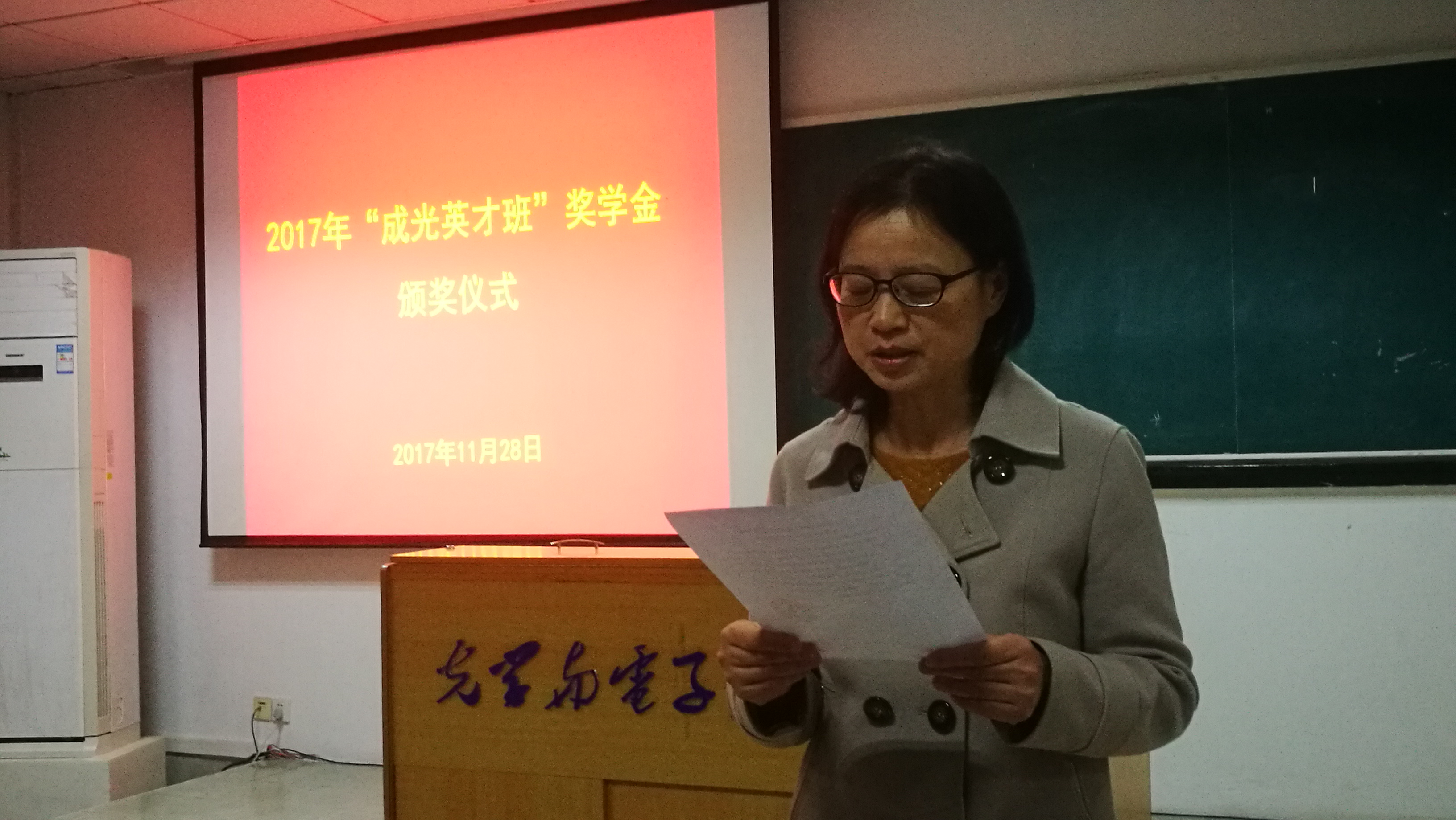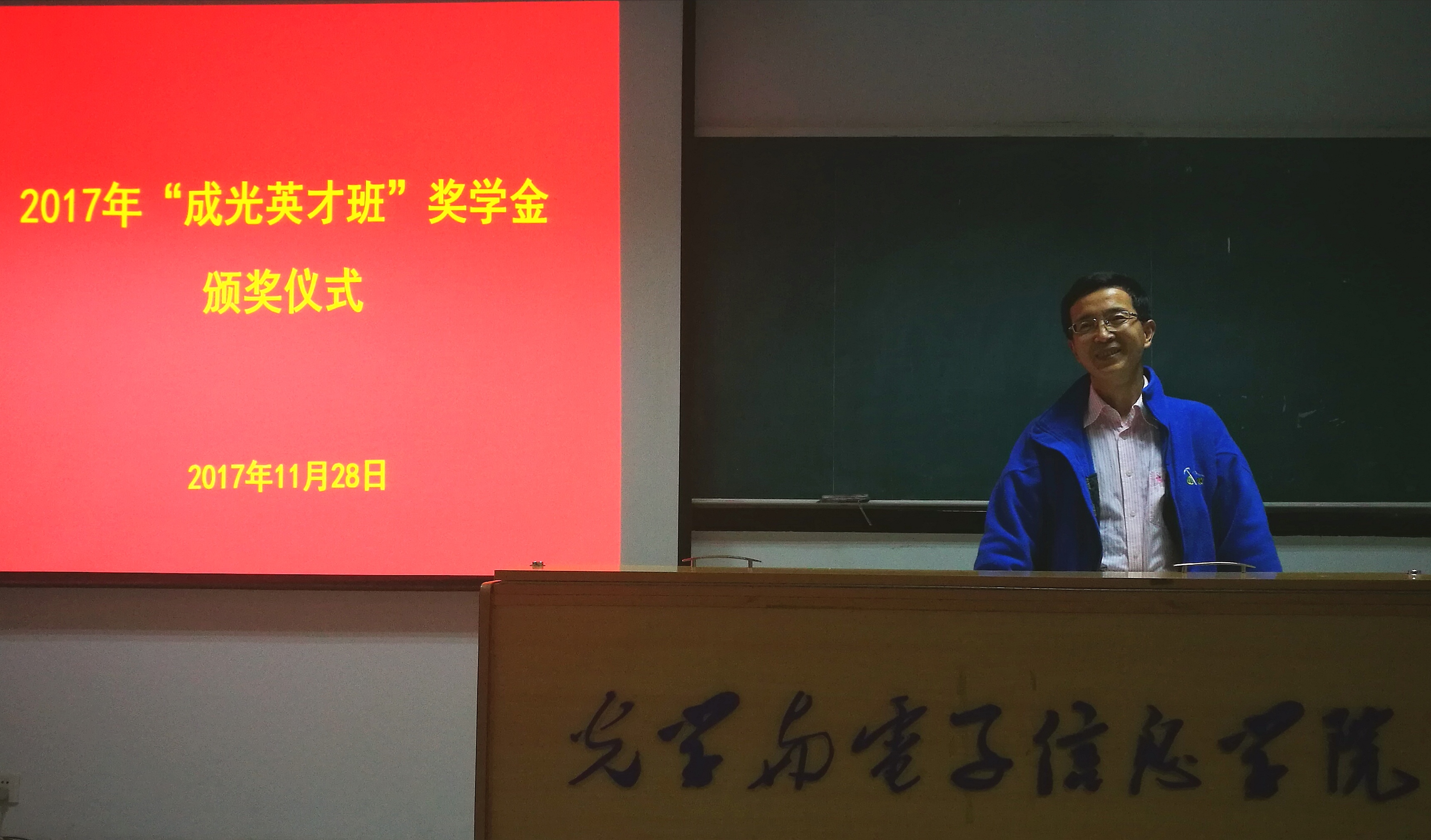 11月28日,光电所与华中科技大学光学与电子信息学院(简称华科光电学院)共建的首届“成光英才班”奖学金颁奖仪式在华科光电学院南五楼613教室举行。光电所总质量师范天泉研究员、华科光电学院副院长杨晓非教授应邀出席颁奖仪式并致辞。光电所人事教育处处长唐小萍研究员出席并宣读了获奖名单。两届英才班学生、华科班主任余洪斌教授、光电所张兰强副研究员等共50人参加了仪式。仪式由研究生部向银辉老师主持。