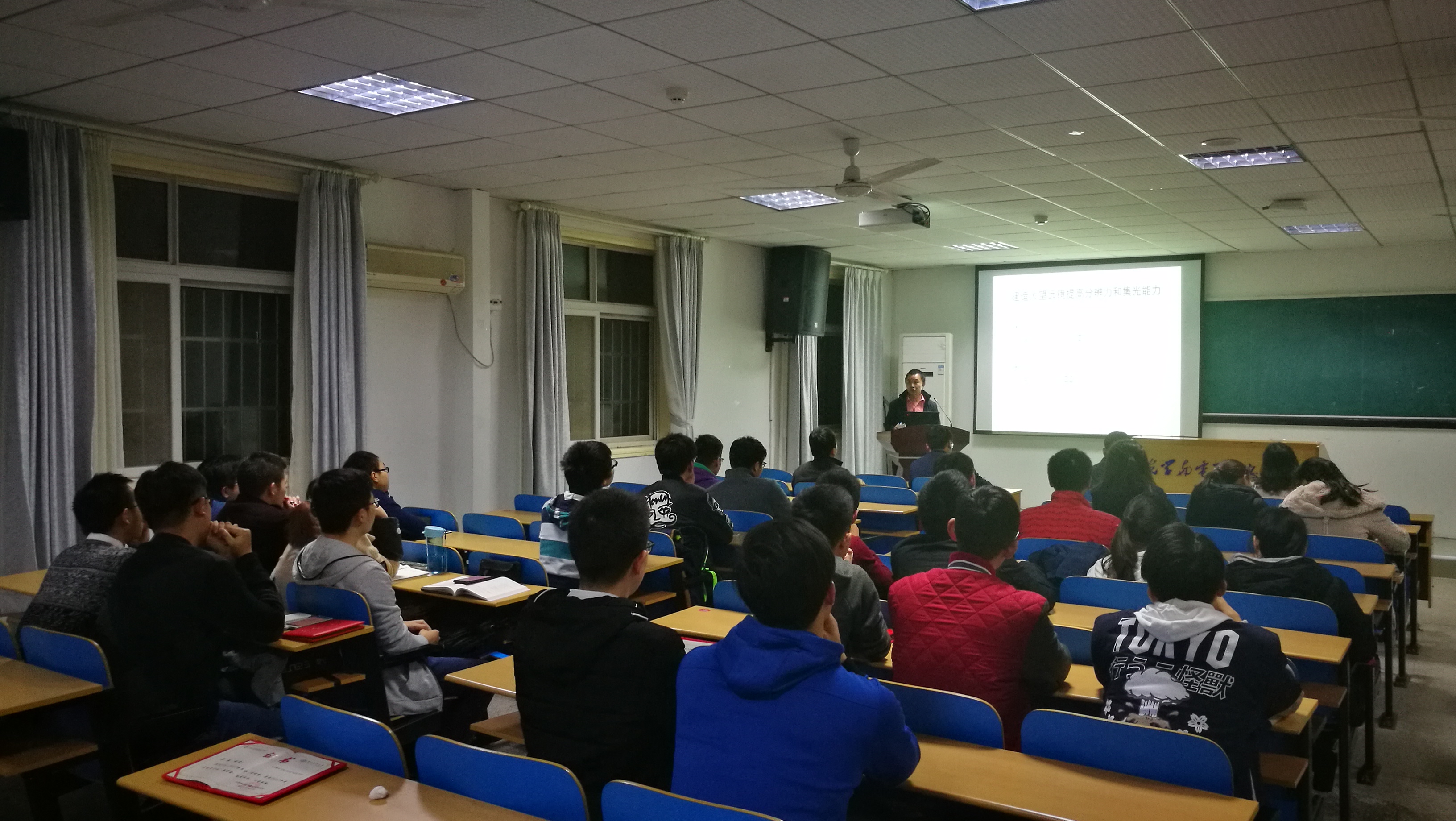 颁奖仪式后,张兰强为成光英才班学生作了题为《地基大口径光学望远镜及高分辨力成像技术发展概况》的报告,他主要围绕我们为什么要发展大口径地基望远镜、为什么要将自适应光学引入高分辨力天文和太阳观测等方面简要介绍了光电所在地基大口径光学望远镜研制以及太阳高分辨力层析成像方面的科研动态、进展以及取得的国际先进成果。报告深入浅出、趣味性、科普性较强,现场气氛热烈。报告后,张兰强还就同学们关心的地基光学望远镜与FAST、拼接镜与整体镜的各自特色,以及复眼成像与拼接镜成像图像融合等问题进行了充分热烈的交流互动。