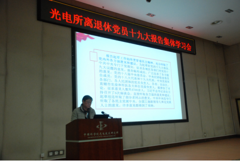通过报告,光电所离退休党员对十九大报告主要内容、本次及以往各届全国党代会、党章的发展情况有了整体认识,对党和国家的未来充满信心,重点对十八大以来中科院及光电所取得的重大创新成果有更详细的了解,增强了老同志们作为科学院人的自豪感,增强“四个自信”。