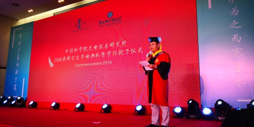 毕业生代表谢宗良随后通过分享自己从学业中的失望、挫折无助到经过不懈努力终于换来“蓦然回首,那人却在灯火阑珊处”的欣喜若狂的经历与感悟,表达了对光电所的挚爱和眷恋,对导师的感激和敬意,对同学的祝福和不舍。倡议同学们脚踏实地、放飞梦想,带着光电所、国科大的希冀,带着青春的满腔热血,肩负科技强国的历史使命,到中流击水,浪遏飞舟!