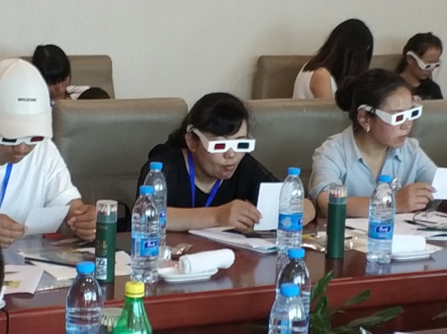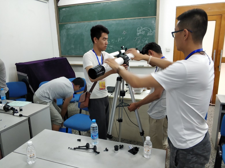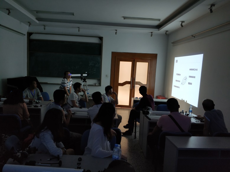 下午为科学探究课程。光电所设置有望远镜探究课程、神器激光探究课程、走进奇幻的平面3D世界探究课程和全息技术探究课程。望远镜探究课程中,授课老师段昳晖从望远镜的历史开始到望远镜的原理和现代望远镜的种类进行了详细讲解,教师们亲自动手体验望远镜的装配和观星调试,并对远处的建筑物进行实际观测实验;神器激光探究课程中,参加培训的教师们亲自体验激光阵,感受激光的神奇魅力,授课老师刘筱东为大家讲解激光原理及应用,带领大家装配激光红外报警装置。全息技术探究课程中,授课老师李凡星为大家讲解全息基本原理及在生活中的应用,带领大家制作3D全息装置,并互相交流探讨全息技术教学经验;平面3D世界的探究课程中,授课老师哈颖丽讲解了平面3D图的原理和绘画和观看方法、3D眼镜的原理和制作方法、偏振片的原理和应用以及3D电影的制作,老师们动手绘制3D图并进行观测实验,由浅入深探究平面3D技术。