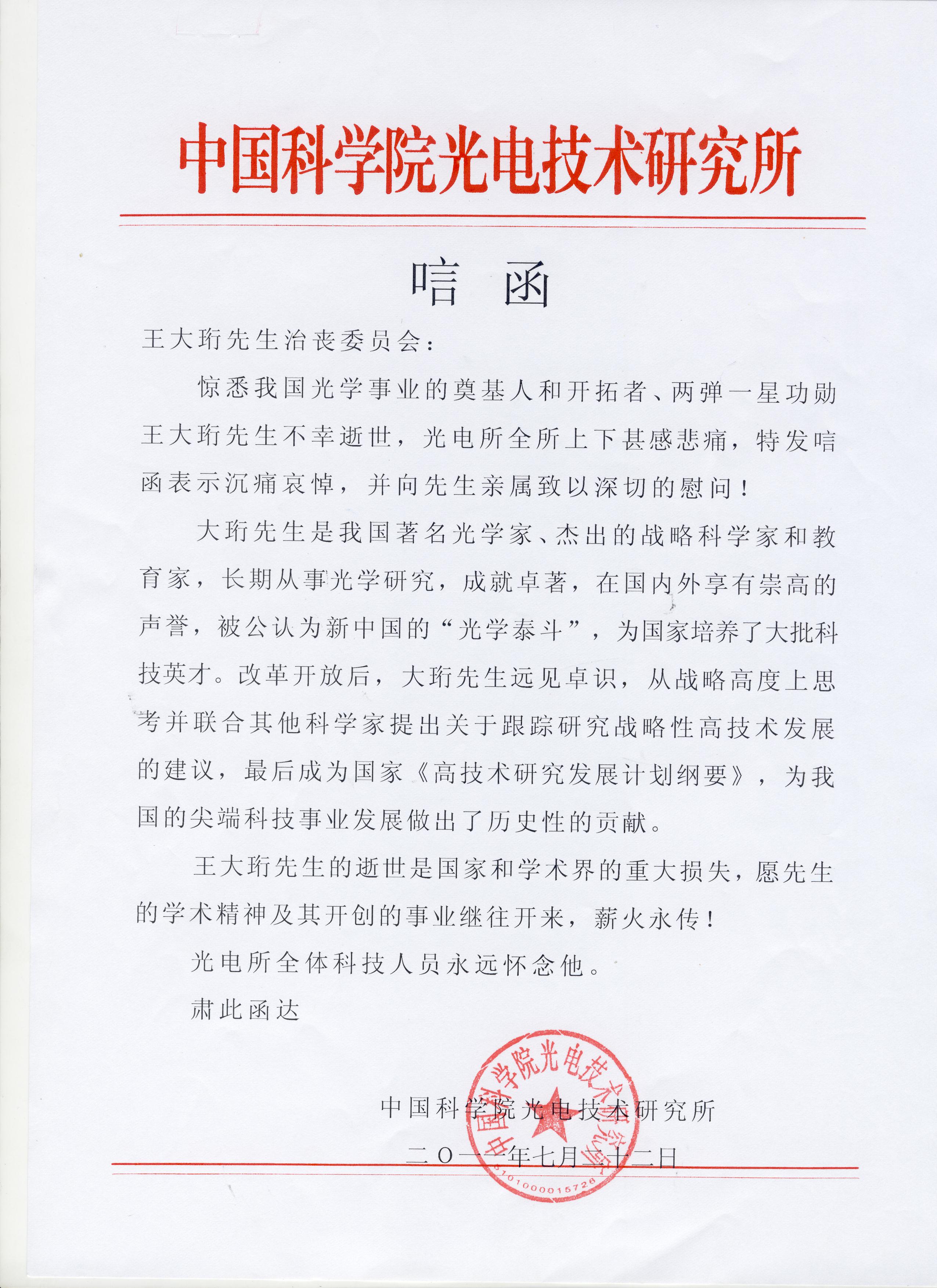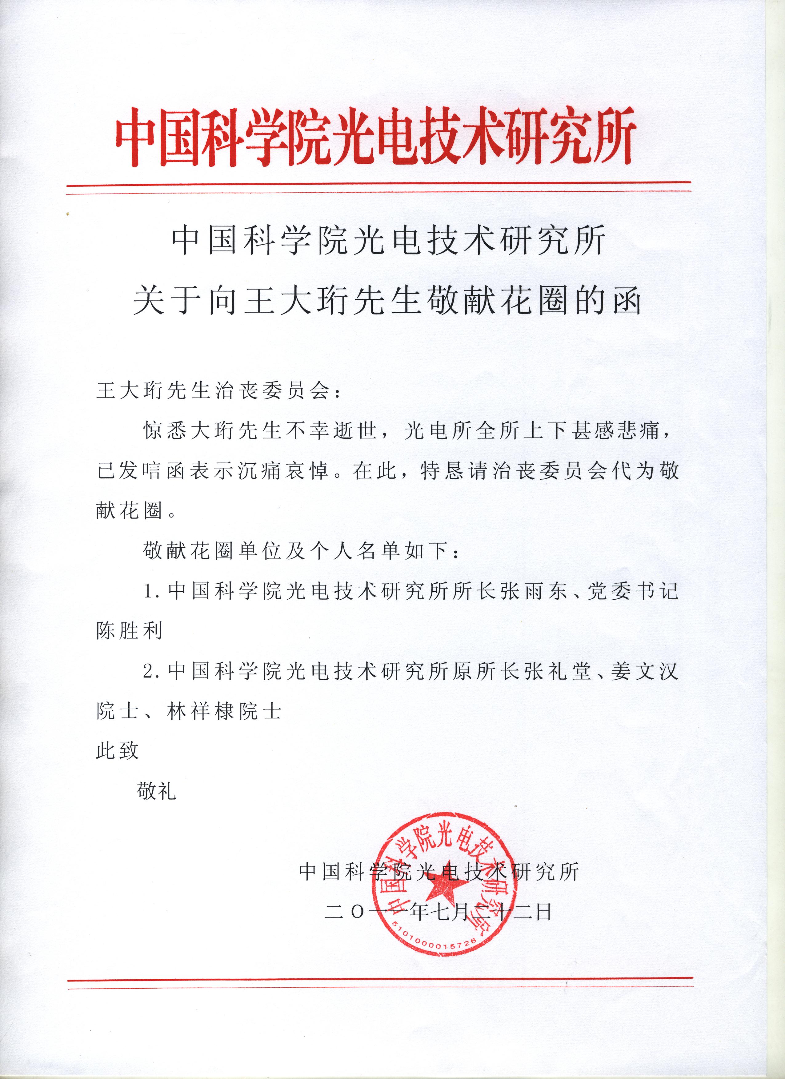 中国科学院光电技术研究所于7月22日发出唁电,深切缅怀王大珩院士,我所张雨东所长并和姜文汉、林祥棣两位院士于7月29日专程赴京参加王大珩先生的遗体告别仪式,并向王大珩院士敬献花圈。