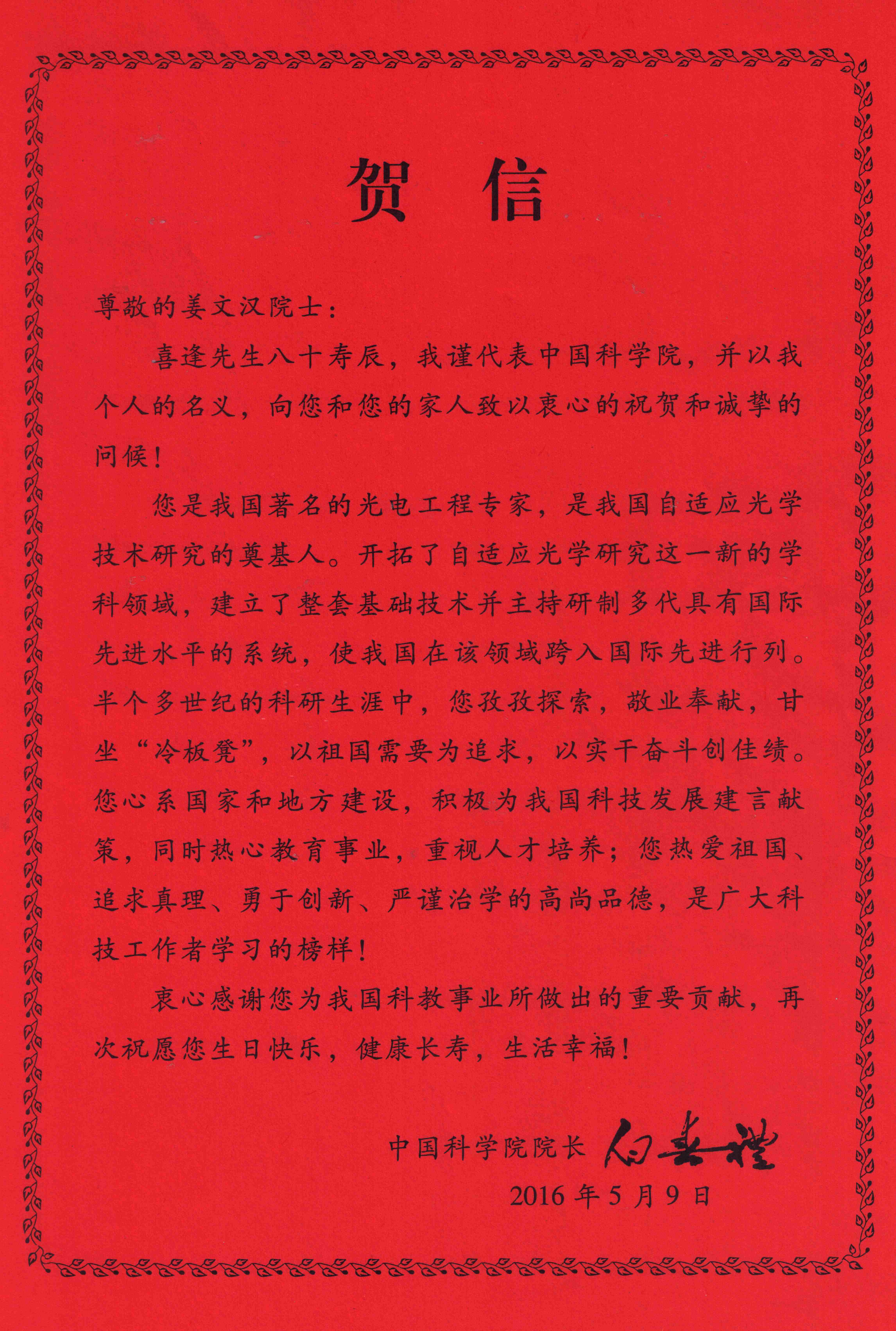 喜逢先生八十寿辰,我谨代表中国科学院,并以我个人的名义,向您和您的家人致以衷心的祝贺和诚挚的问候!