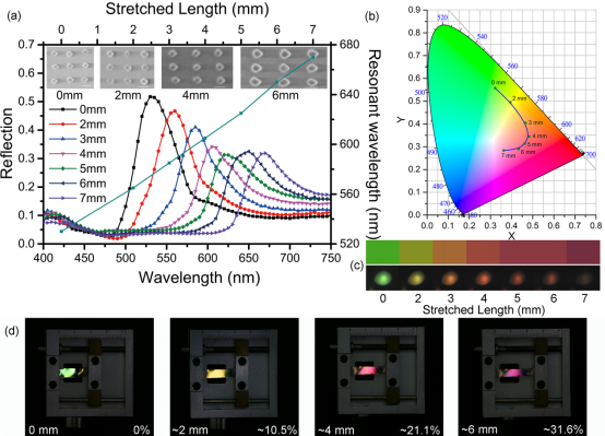 为解决目前结构色工作中动态调控所存在的问题,中国科学院光电技术研究所微细加工光学技术国家重点实验室团队将聚二甲基环氧烷(PDMS)作为可拉伸衬底引入到传统等离子体结构中来构建动态可调的结构色。相较于传统亚毫米级尺寸结构色器件,该团队通过干涉曝光技术、PDMS嵌套保护等优势技术制备出晶片尺寸的实验器件。在宏观光学(正入射)测试条件下,该纳米结构复合体系中的共振机制能产生的高纯度结构色,且在PDMS衬底拉伸过程中,器件所呈现出的色彩可从绿色变化到紫红色。此外,复合体系结构中的物理机制也得到了近一步分析。这种基于可拉伸衬底的结构色在快速心率监测、生物传感、力学测量方面具有潜在优势。