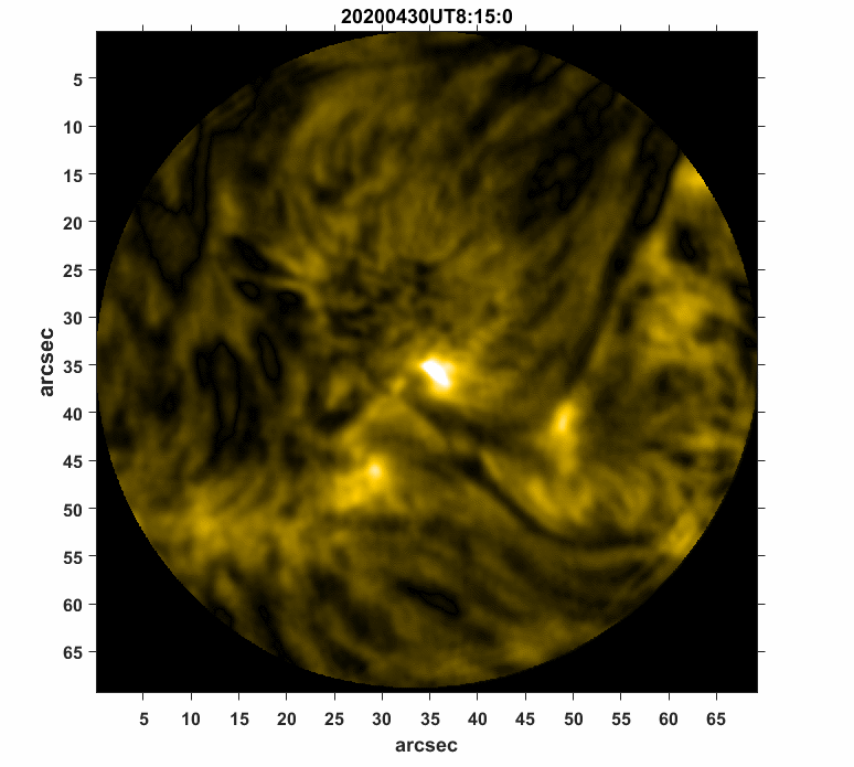 2020年4月30日,研究人员对太阳活动区AR12760进行了追踪观测,目标锁定为活动区的负极小黑子,最终获得了一个多小时(07:53-09:01 UT)的高分辨率观测数据(图2)。TiO图像显示了太阳光球层,Hα图像显示光球层上方的色球层。随着时间演化,在TiO图像中,负极小黑子明显地向外延伸出条状气孔,反映了活动区磁流的连续浮现过程;在Hα图像中,我们可以清楚看到两根细小暗条扎根于这个下方的小黑子,而且这两个暗条足点处发生了相互作用,产生了一些增亮,最下方两分多时间的Hα图像和视频(图3和图4)展示了暗条足点增亮的瞬间,可能是活动区的连续磁流浮现导致了两条暗条之间的相互作用并产生增亮。研究团队正联合太阳物理学家利用观测数据对该事件进行详细分析研究。