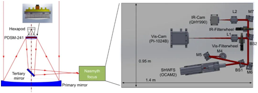 中国科学院光电所自适应光学研究团队介绍了光电所研制的新型241单元PDSM及其在丽江观测站1.8-m自适应望远镜上的应用。241单元变形次镜(PDSM-241)配备了一个直径为320 mm的石英反射镜,如图1所示,通光孔径为270 mm,包含241个压电驱动器,通过改变其镜面面形进行波前校正。PDSM-241自校正后的镜面像差RMS约为10 nm。图2展示了丽江1.8-m自适应望远镜的结构:PDSM-241与六足定位机构(Hexapod)组合在一起构成组合波前校正装置,实现大行程、高精度的精密跟踪与高阶像差校正。被大气湍流扭曲的恒星光束首先经过主镜反射,然后由PDSM-241、Hexapod组合波前校正装置进行波前畸变校正,之后通过第三镜反射到耐氏焦点的波前传感器和成像相机。