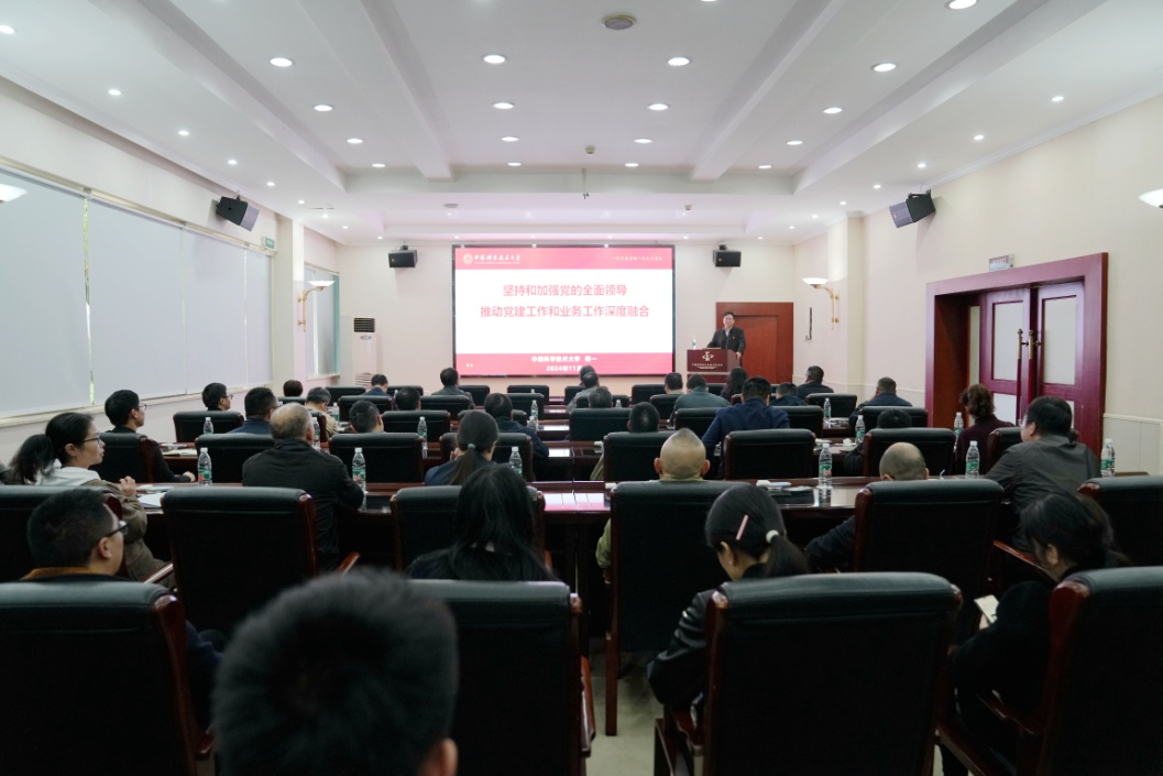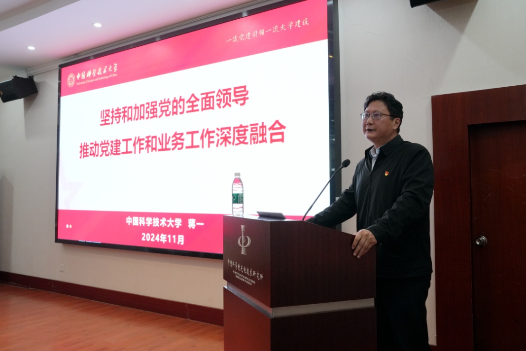 会上,蒋一教授以《坚持和加强党的全面领导 推动党建工作和业务工作深度融合》为题作专题报告。报告以中科大党建工作情况为范例,从“中国科大的使命担当和基本情况”“坚持和加强党的全面领导,推动党建工作和业务工作深入融合”“中国科大深化‘红专工程’建设的实践和探索”等几个方面,对研究所如何加强党建和中心工作的深度融合进行了深入剖析。