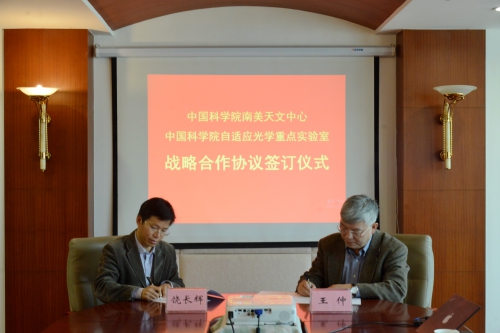 3月19日上午, 中科院光电所副所长饶长辉研究员和中科院南美天文研究中心主任王仲研究员分别代表中科院自适应光学重点实验室和中科院南美天文研究中心签署了双方战略合作协议, 旨在进一步加强双方在天文观测大科学项目研究、天文观测科研仪器研发、天文台筹建工作等方面的合作,同时积极开拓各方发展契机,服务国家需求。