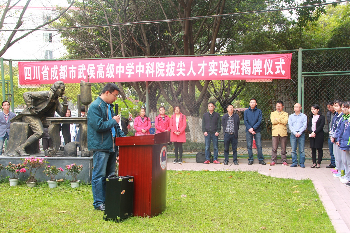 2017年4月26日下午,成都武侯高中科普讲座暨“中科院拔尖人才实验班”(简称科创班)揭牌仪式正式举行。参与活动的人员有中国科学院光电技术研究所科学传播办副主任陈勇,武侯区教育局体卫艺科廖华老师以及校长张剑、全体行政干部以及中科院拔尖人才实验班全体师生。