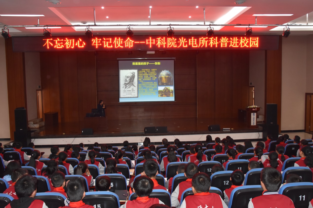 2018年10月17日,光电所开展以“‘不忘初心,牢记使命’中科院光电所科普进校园”为主题的科普交流活动。光电所党委副书记、副所长魏全忠一行6人来到广安市四川师范大学附属第七实验中学(简称川师七中)、岳池县四川师范大学附属第九实验中学(简称川师九中)为川师七中、川师九中“科普进校园”示范学校挂牌。广安市共青团委书记李俊霏女士、广安市教育局副局长谢文锦先生、广安市科协副主席蒋启茂先生、鑫冬石教育集团副董事长蒋红星先生、川师大七中校长郭开全先生、川师大九中校长刘亚东先生等嘉宾莅临仪式现场。