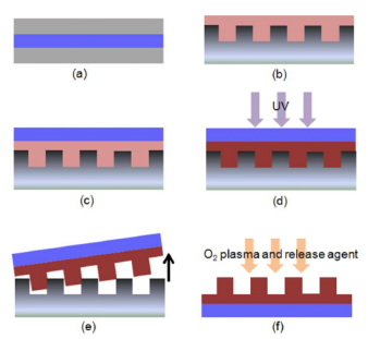 曲面基底上的纳米结构在许多领域都有着重要应用,例如仿生学、柔性电子学和光学器件等。传统的纳米压印技术通常采用刚性模板,可以实现亚10nm的分辨率,但是模板不能弯折,无法在曲面基底上压印制备纳米结构。而采用弹性模板的软压印技术可以在无外界提供压力下与曲面保形接触,实现结构在非平面基底上的压印复制,但是由于弹性模板的杨氏模量较低,所以压印结构的分辨率和精度都受到限制。