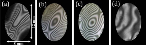 图2为检测实验现场图,图3为变形镜产生第四项和第九项zernike面形时,DS得到的变形条纹图和对变形镜面形变化的检测结果。实验中被测件为一带有像散的未知曲面,如图4(a),其面形误差超过了干涉仪的测量动态范围,因此干涉仪无法获得条纹而无法完成测量。基于该研究提出的测试装置及SPGD自适应搜索模型,在200秒左右就可获得待测自由曲面的清晰条纹,如图4(d)所示。这样根据检测硬件建立系统检测模型,结合干涉检测结果和条纹反射测量结果,通过面形匹配与系统误差标定技术,得到被测面的面形误差,检测结果如图5所示。