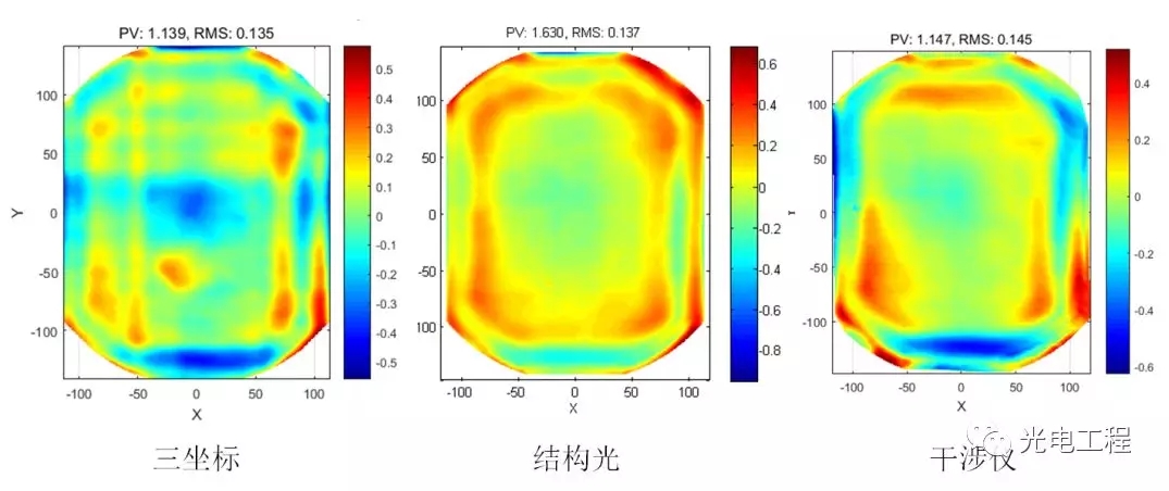 光电所先进光学研制中心赵文川副研究员科研团队多年来一直致力于结构光面形检测技术的研究工作,将结构光技术引入光学镜面的面形检测之中,提出了多种结构光镜面面形检测方法,实现了对大口径非球面、离轴非球面以及自由曲面的高精度面形检测。图1所示为对一块离轴非球面分别采用三坐标机、结构光和干涉仪进行测量的结果。从图中可以看出,此时已是三坐标机测量精度的极限,结构光技术与干涉仪的结果是一致的。