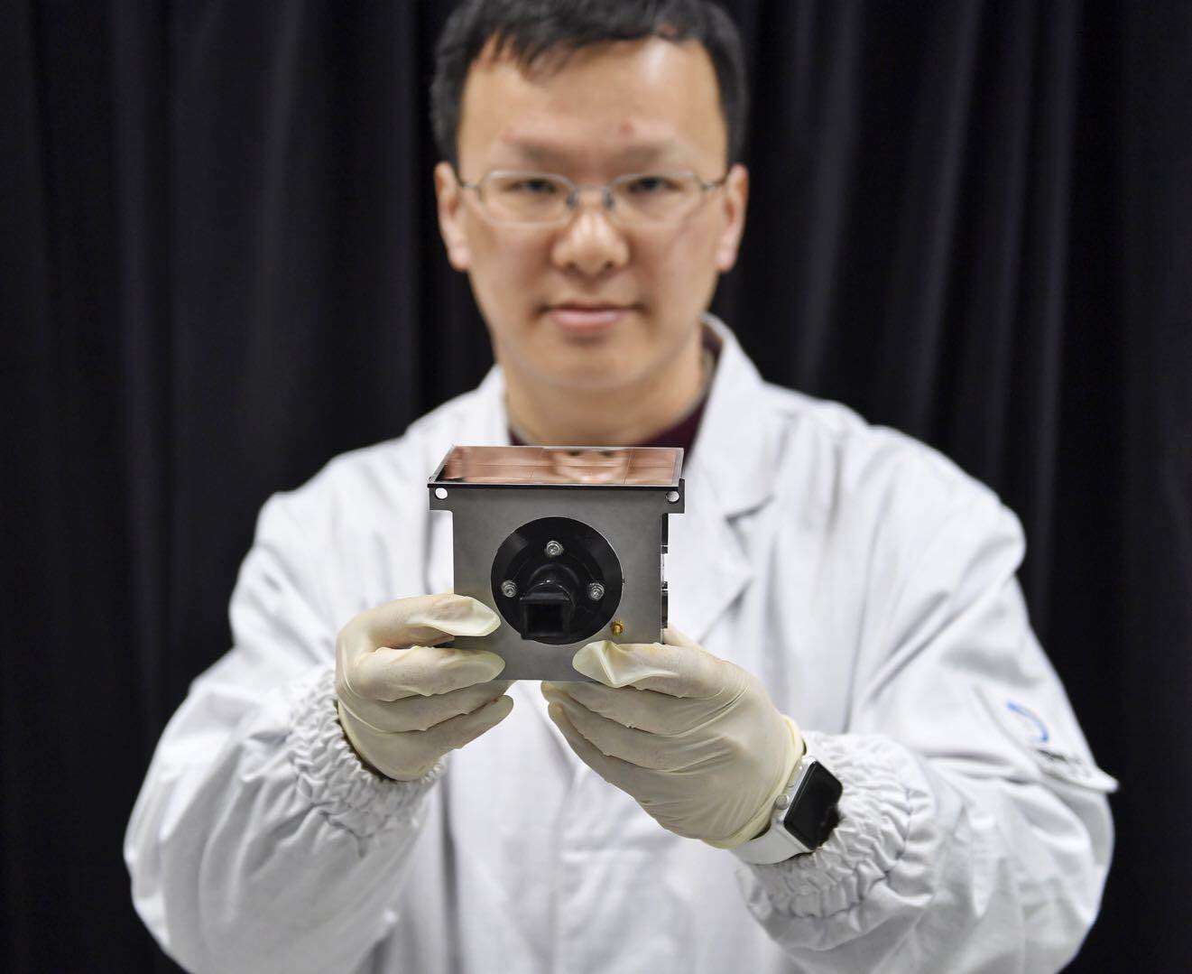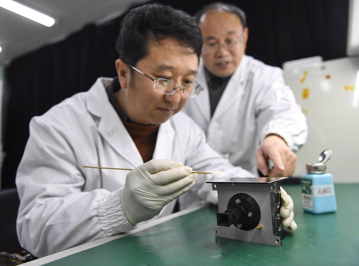 1月17日,中科院光电技术研究所科研人员在展示地形地貌相机样机。
