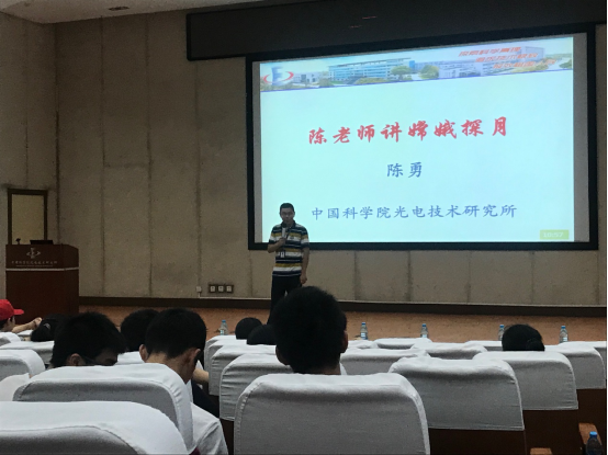 之后,同学们前往光电会议中心聆听陈勇老师讲解《嫦娥探月》专题报告。陈老师用亲切生动的语言向同学们介绍了嫦娥探月工程,并向大家展示了光电所为其所做的贡献。活动结束后,同学们意犹未尽,在相互讨论和交流中为本次活动划划上了圆满的句号。