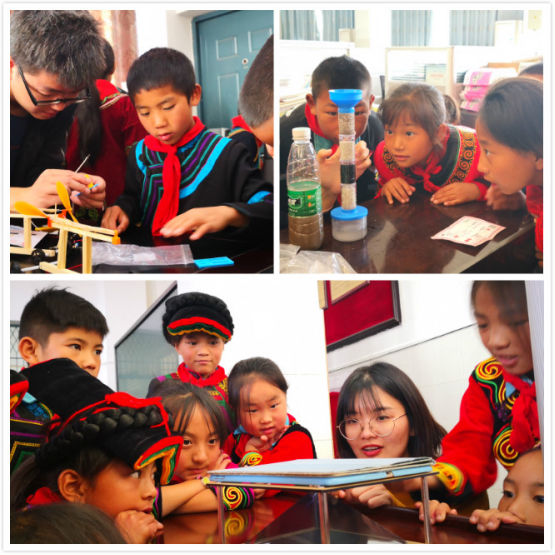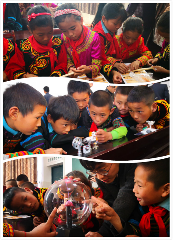 接下来,在学校多功能教室,研究生们与身着彝族服饰的孩子们亲密互动,引导开展生动有趣的科学小实验,鼓励孩子们尽情体验光电科技魅力。实验包括太阳能月球探索舰队、风能动力机械兽、辉光球、蒸汽机、神奇三维投影仪、自制净水器、磁悬浮等。孩子们踊跃参与,该校李校长、杨校长也饶有兴趣与彝族小孩互动实验。