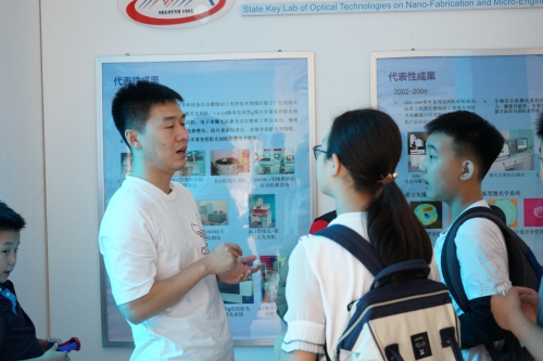 在实验室参观环节,陈勇老师首先带领求真科学营的老师和小朋友们参观了光电所展厅,介绍了光电所的发展历程及取得的科研成果。随后,在老师来同学们来到微细加工光学技术重点实验室。科研人员张作军给小朋友们介绍了微细加工光学方面的科学知识和科研成果,带领小朋友们感受国家实验室的研究氛围。实验室参观的最后一站,同学们走进先进光学加工中心实验室,近距离观察光学加工设备和产品。刘锋伟博士给小朋友们介绍了光电所光学加工设备和正在研制的光学产品。