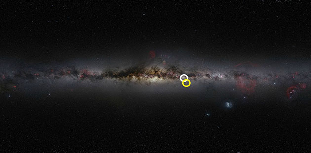 图二:这是光学波段整个天空的照片,正中央是银心所在。图中白色圆圈指示的是此次发现的其中一颗脉冲星J1859-0131在银河中大致的位置,黄圈则是发现的另一颗脉冲星J1931-01的位置。