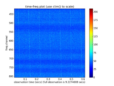 图三:这是全天最亮脉冲星Vela 一段约0.6秒长度的真实数据,横轴是时间(单位是秒),纵轴是频率(单位是兆赫兹),颜色表示强度。其中一条条斜线是Vela发出的脉冲信号。这就是我们存储下来的脉冲星数据应有的样子,只不过我们保存下来的是一组数据表格,而不是这样的图片。图源:http://public.ska.ac.za/kat-7/kat-7-data-reduction/pulsars-and-transients