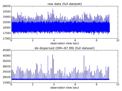 图四:Vela脉冲星总功率随时间变化图,一条条高出来的细线就是脉冲星单个脉冲信号。上面是没有消色散的,下面是消色散之后的。可见消色散之后信号明显了非常多!图源:http://public.ska.ac.za/kat-7/kat-7-data-reduction/pulsars-and-transients