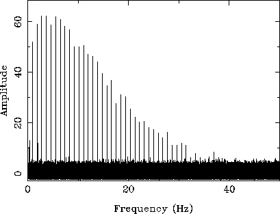 图五:对脉冲星B1550-54消色散后的数据进行傅里叶变换得到的结果。横轴是傅里叶变化之后得到的频率(这里的频率是指信号变化周期的倒数,不是电磁波频率)信息。这颗脉冲星的周期大约是1秒,所以在1赫兹(Hz)的地方有条很明显高出来的线。其他的线是脉冲星信号的谐波。图源:http://sigproc.sourceforge.net/seek/