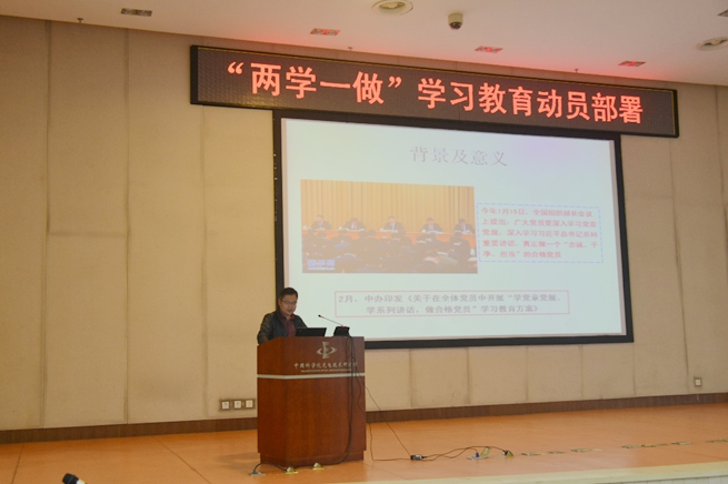 所党委书记杨虎结合光电所实际情况,对光电所开展“两学一做”学习教育作了动员部署报告。报告对光电所开展“两学一做”学习教育的背景和意义进行了详细阐述,在总体要求、学习教育内容、主要措施、组织领导等方面进行了安排部署,提出了具体要求。杨虎指出,开展“两学一做”学习教育是继党的群众路线教育实践活动、“三严三实”专题教育之后,全面从严治党的又一次重要实践,也是推动学习教育从“关键少数”向全体党员拓展,从集中性教育活动向经常性教育延伸的重要举措。在光电所党员中开展“两学一做”学习教育是解决党员队伍中存在问题的有效途径,也是提升研究所科技创新能力的必然要求。