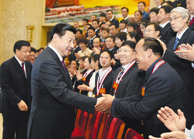 第四届全国道德模范及提名奖获得者。这是习近平等中央领导同志与参加会见的同