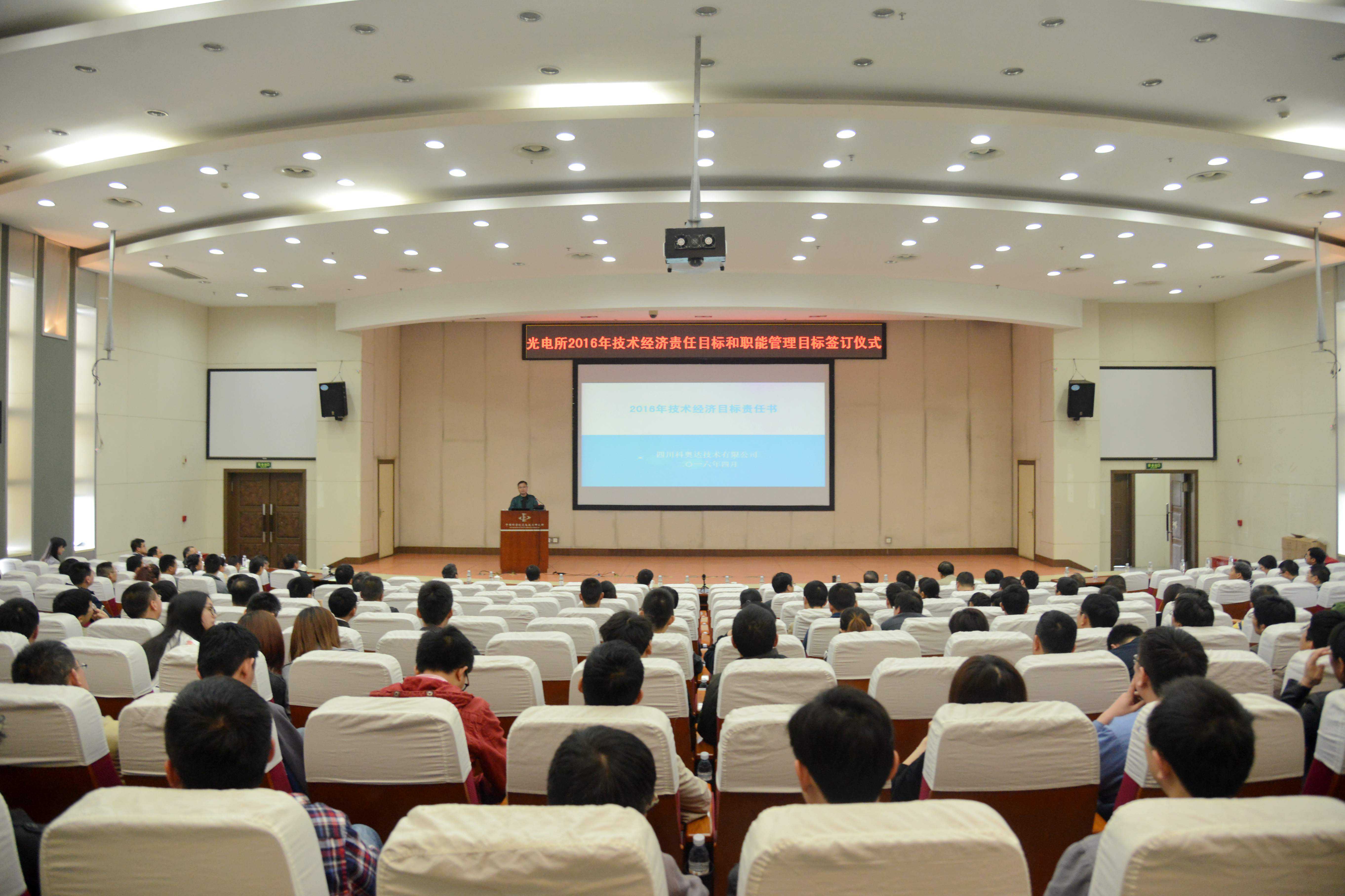 4月8日下午,光电所在学术报告厅举行2016年度技术经济目标和职能管理目标责任书签字仪式。所领导班子成员、职代会主席团成员、全所副高以上科研人员、机关全体职工及四川科奥达公司相关负责人参加会议。党委书记杨虎主持会议。